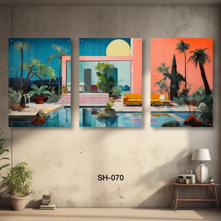 תמונות זכוכית לסלון – SH-070. שלוש תמונות על זכוכית של נוף בייתי עם בריכה. מתאים גם לעיצוב הבית בצורה יוקרתית וייחודית. זכוכית מחוסמת 6מ"מ הדפסה על זכוכית בטכנולוגיה UV חדשנית.