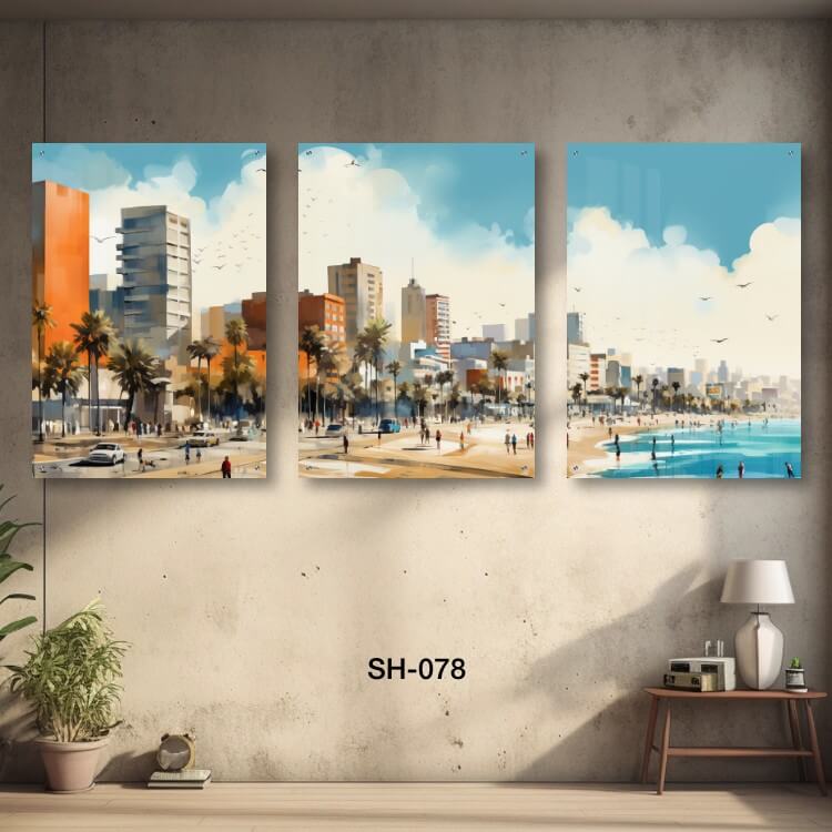 תמונות זכוכית מחולקות לסלון של נוף חוף. SH-073. שלוש תמונות על זכוכית של נוף חוף ים בניינים גבוהים. מתאים גם לעיצוב הבית בצורה יוקרתית וייחודית. זכוכית מחוסמת 6מ"מ הדפסה על זכוכית בטכנולוגיה UV חדשנית.