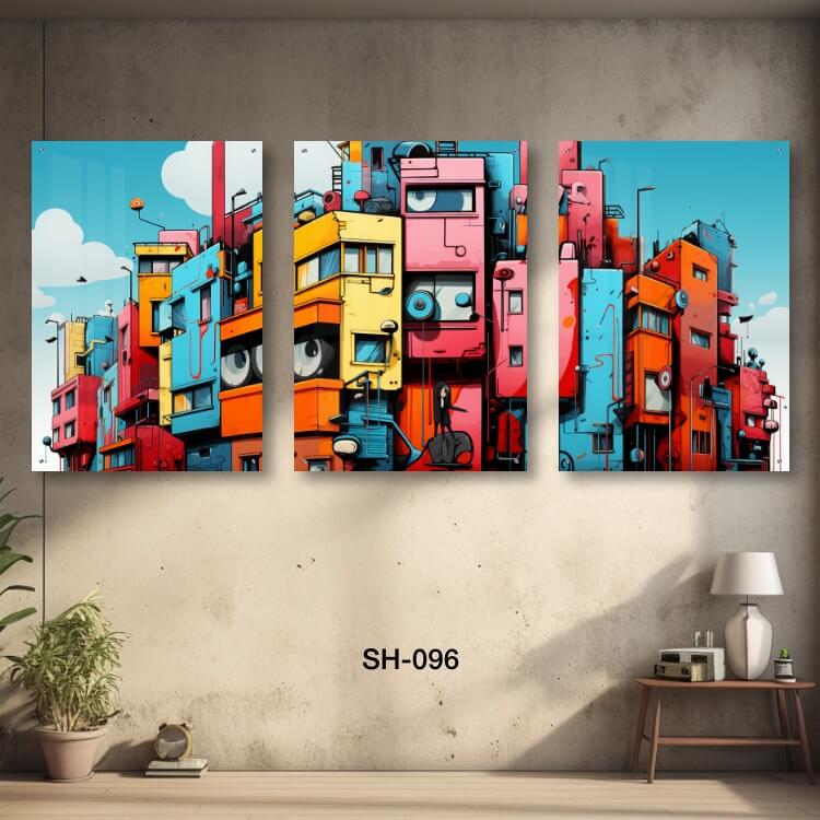 תמונות זכוכית לחדר שינה – SH-096. שלוש תמונות על זכוכית של בניינים עם פרצופים צבעוניים בסגנון פופ ארט. מתאים גם לעיצוב הבית בצורה יוקרתית וייחודית. זכוכית מחוסמת 6מ"מ הדפסה על זכוכית בטכנולוגיה UV חדשנית.