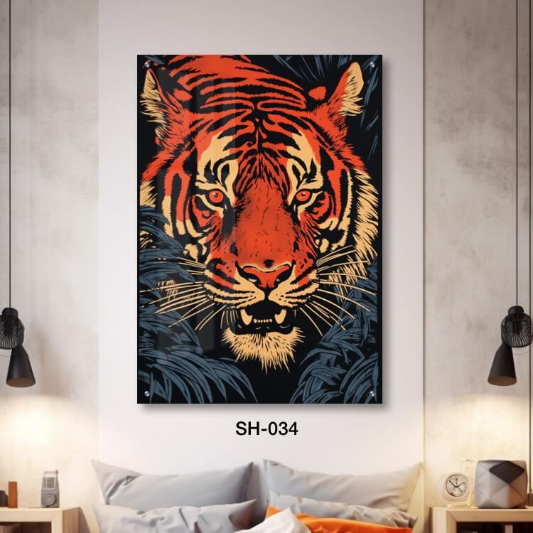 תמונת זכוכית לחדר שינה – SH-034. תמונה על זכוכית יפה של טיגריס מצויר הולך בשיחים . מתאים גם לעיצוב הבית בצורה יוקרתית וייחודית. זכוכית מחוסמת 6מ"מ הדפסה על זכוכית בטכנולוגיה UV חדשנית.