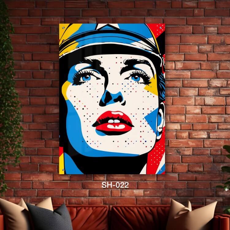 תמונת זכוכית לחדר שינה – SH-022. תמונה על זכוכית יפה של פרצוף צבעוני של אישה בסגנון קומיקס מצויר. מתאים גם לעיצוב הבית בצורה יוקרתית וייחודית. זכוכית מחוסמת 6מ"מ הדפסה על זכוכית בטכנולוגיה UV חדשנית.