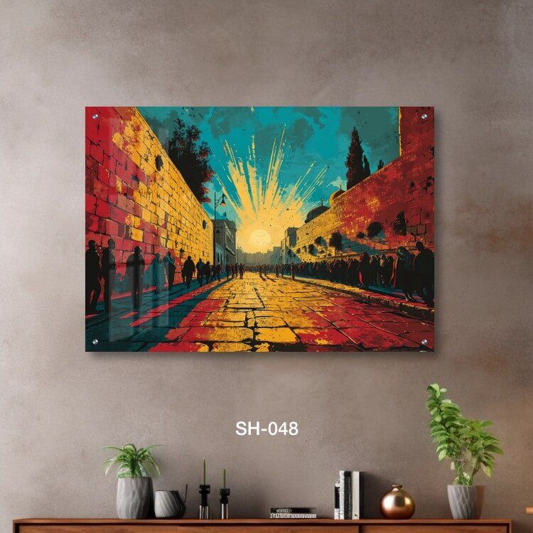 תמונת זכוכית לסלון – SH-048. תמונה על זכוכית יפה של רחוב ישן מלא אנשים מצוירים ושקיעה. מתאים גם לעיצוב הבית בצורה יוקרתית וייחודית. זכוכית מחוסמת 6מ"מ הדפסה על זכוכית בטכנולוגיה UV חדשנית.