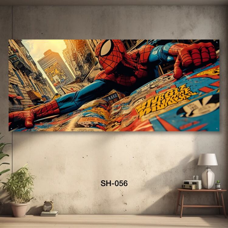 תמונת זכוכית לחדר שינה – SH-056. תמונה על זכוכית מגניבה של ספיידרמן על קיר קומיקס. מתאים לבית בצורה יוקרתית וייחודית, זכוכית מחוסמת 6מ"מ. הדפסת תמונות על זכוכית בטכנולוגיה UV חדשנית.