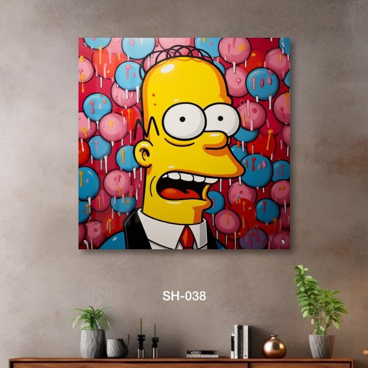 תמונת זכוכית לסלון – SH-038. תמונה על זכוכית יפה של הומר סימפסון מופתע ברקע כדורים ורודים וכחולים. מתאים גם לעיצוב החדר השינה בצורה יוקרתית וייחודית. זכוכית מחוסמת 6מ"מ הדפסה על זכוכית בטכנולוגיה UV חדשנית.