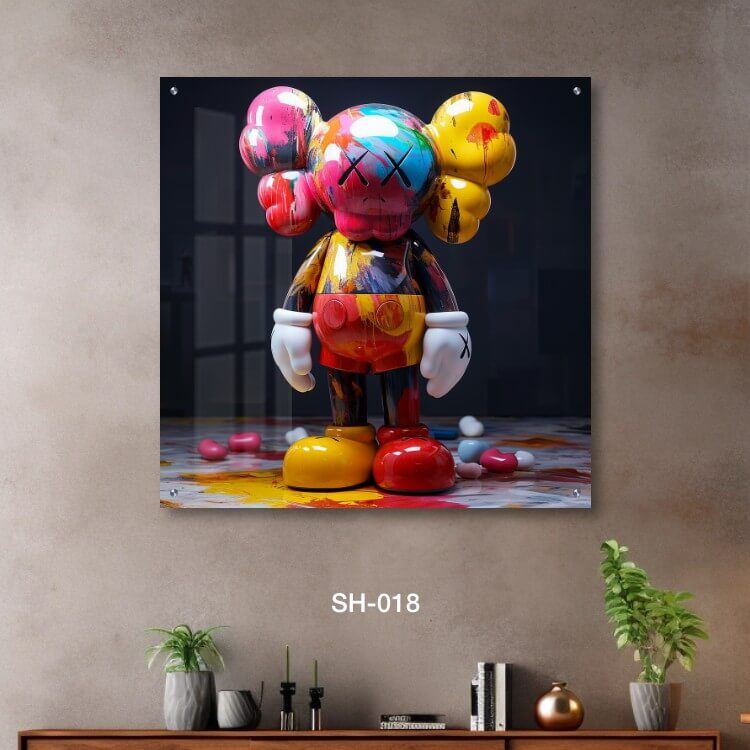 תמונת זכוכית – SH-018. תמונה על זכוכית יפה של בובה מלוכלכת מצבעים שונים בסגנון פופ ארט. מתאים גם לעיצוב החדר השינה בצורה יוקרתית וייחודית. זכוכית מחוסמת 6מ"מ הדפסה על זכוכית בטכנולוגיה UV חדשנית.