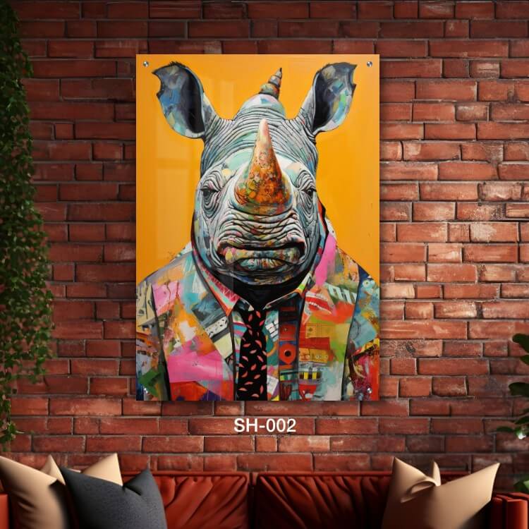 תמונת זכוכית – SH-002. תמונה על זכוכית יפה של קרנף לבוש בחליפה צבעונית ברקע כתום ובסגנון פופ ארט. מתאים גם לעיצוב הבית בצורה יוקרתית וייחודית. זכוכית מחוסמת 6מ"מ הדפסה על זכוכית בטכנולוגיה UV חדשנית.