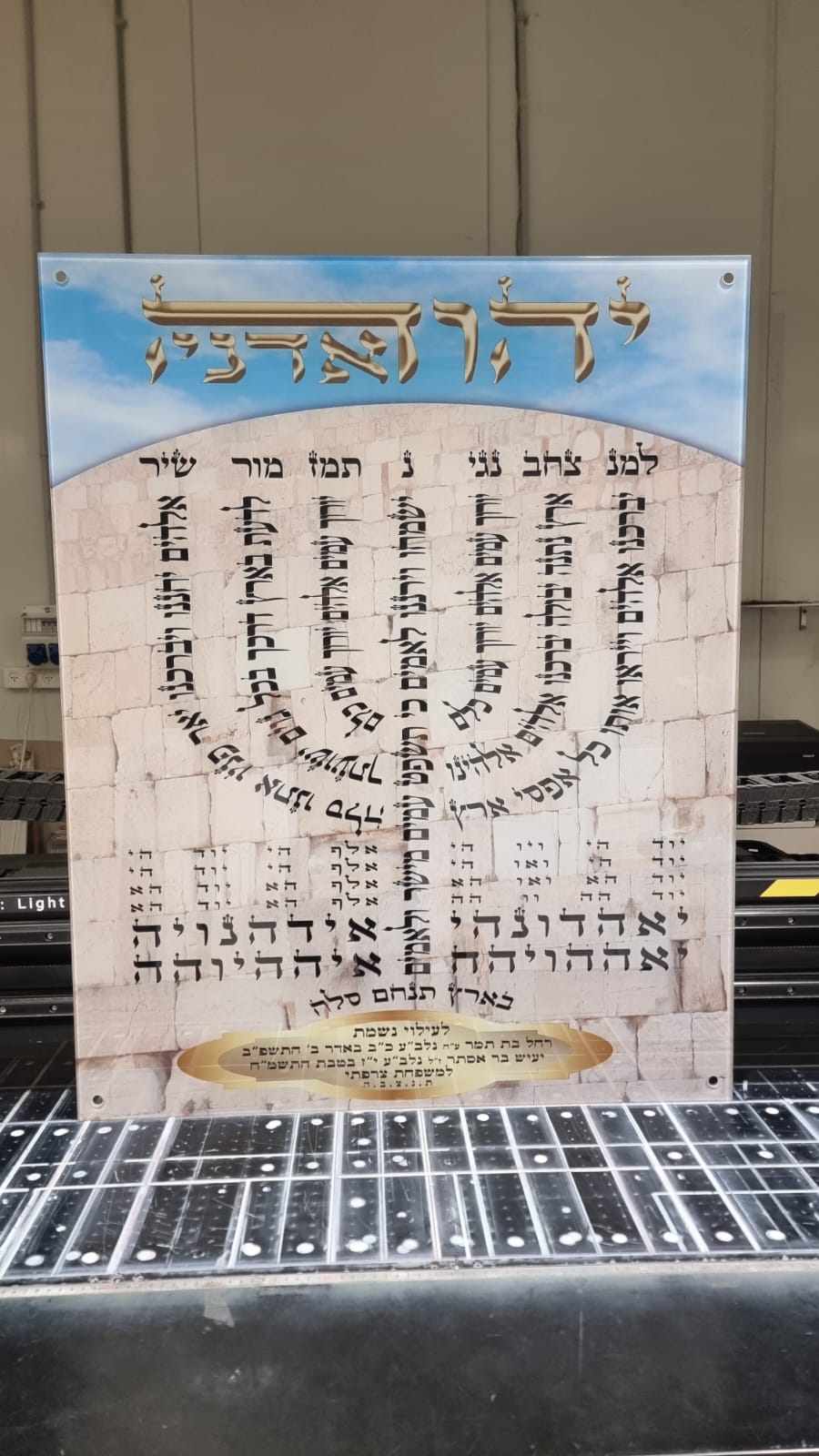 שלטים ותמונות לבית הכנסת מודפס על גבי זכוכית בעובי 6ממ זכוכית מחוסמת ובטיחותית, ניתן להכין מגוון רחב של מידות וסוגי שלטים בהתאמה אישית, לדוגמא ברכת המוציא, שמע ישראל ושלטי חס ורחמים, מזמור לדוד, בריך שמה, ברכות הכהנים, מודים דרבנן, קדיש על ישראל, למנצח, ועוד הרבה ברכות עם תוספת עילוי נשמת הנפטרים והיקרים שלכם אם יש לכם רעיון לפסוק שיודפס על השלט, אתם כמובן יכולים לפנות אלינו ואנו נדאג לתת מענה אנושי וליווי אישי עד לקבלת העיצוב המושלם של בית הכנסת.